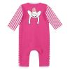 Комбинезон имеет круглый вырез, декорирован повторяющимся рисунком, оснащен необходимыми застежками-кнопками.